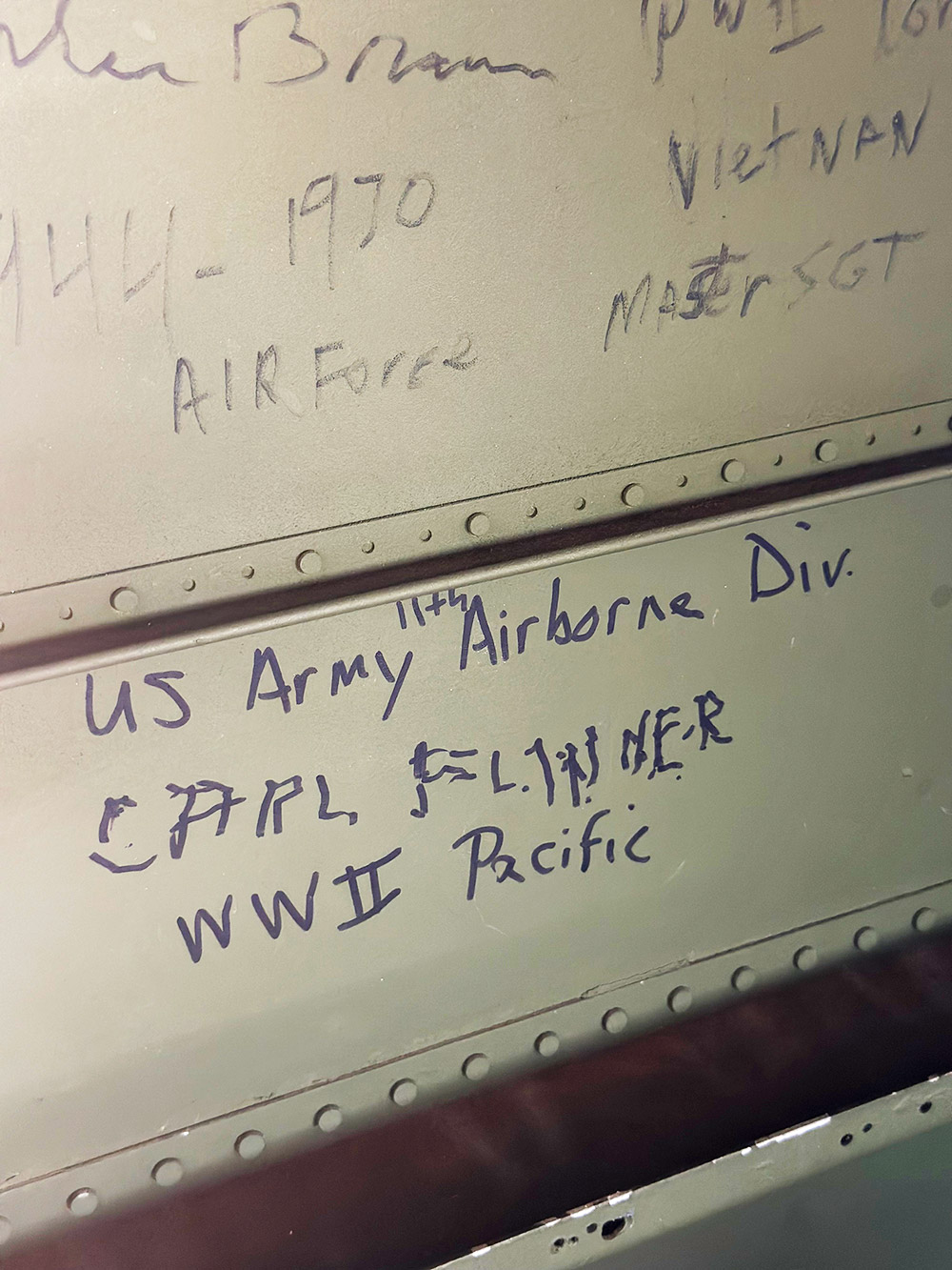 Scribbled on the left and right of the fuselage, I read the name and rank tattooed on the metal of a US Army 11th Airborne Division soldier from World War II, Pacific. Above the engraving was a Vietnam Airforce Master Sergeant from 1944-1970 and another from the US Navy USS Cabot, 1946-1950.