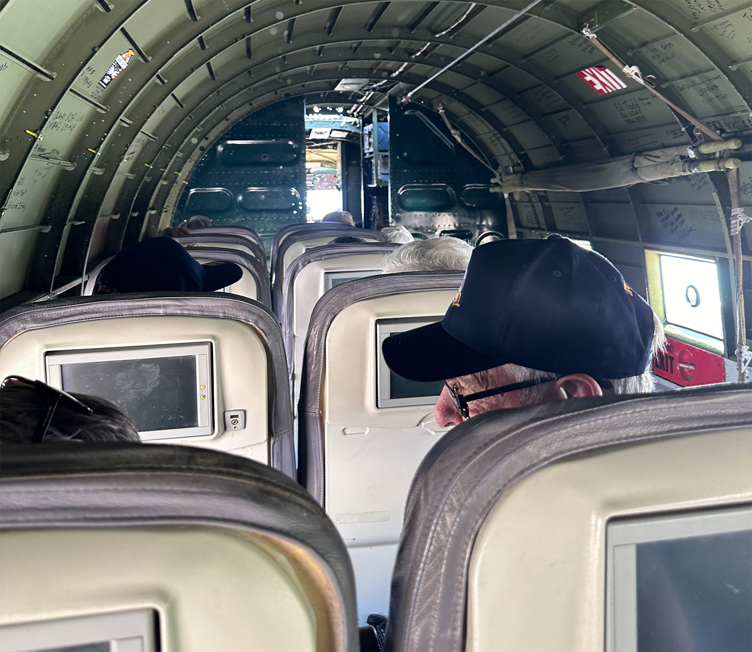 I wanted a picture of those beautiful DC-3 wings. As I leaned forward to take a photo, the loadmaster explained about a passenger who lost her cell phone out the porthole. Right away, I stuffed my iPhone inside the small pocket in front of my knees, next to the barf bags.