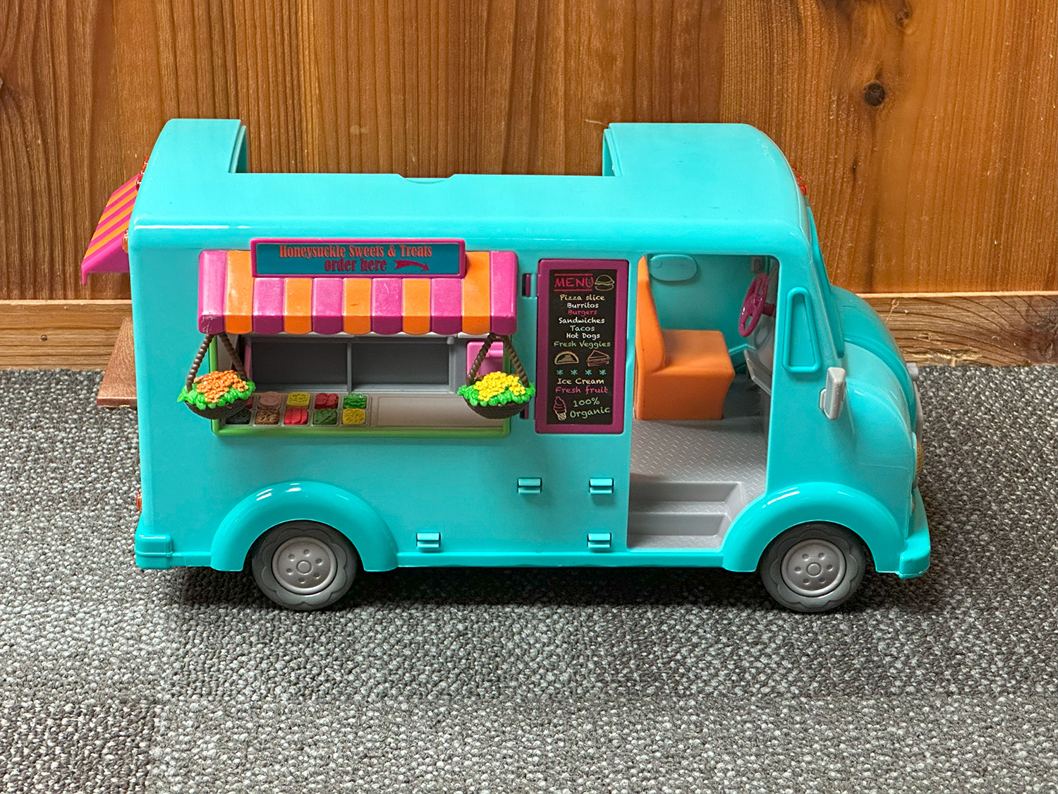 Their energetic kid pulled out a plastic Volkswagen van food truck with a sliding door, menu, awning, hanging baskets, and window buffet to play with while his father and my husband talked business.